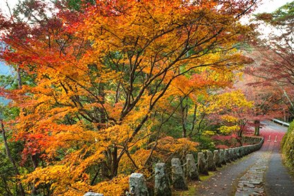 以櫻花聞名的吉野山,秋天則被紅葉覆滿山頭。三萬棵楓樹與櫨樹同時變色,遠望宛如紅色雲海。
