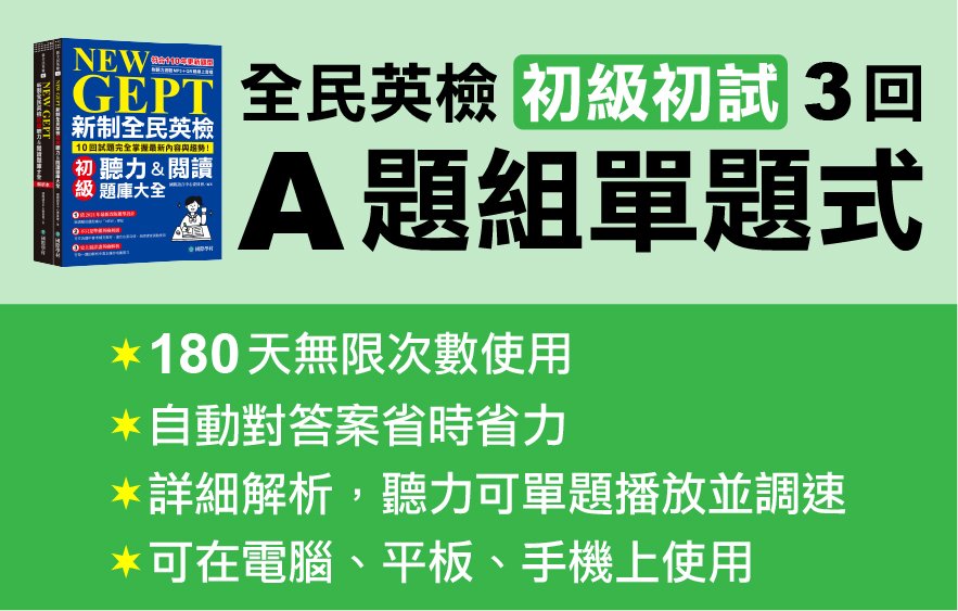 (付費商品!單題式+全卷式)3回 NEW GEPT 新全民英檢【初級】聽力+閱讀 題庫大全 A題組