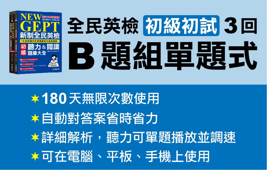 (付費商品!單題式+全卷式)3回 NEW GEPT 新全民英檢【初級】聽力+閱讀 題庫大全 B題組