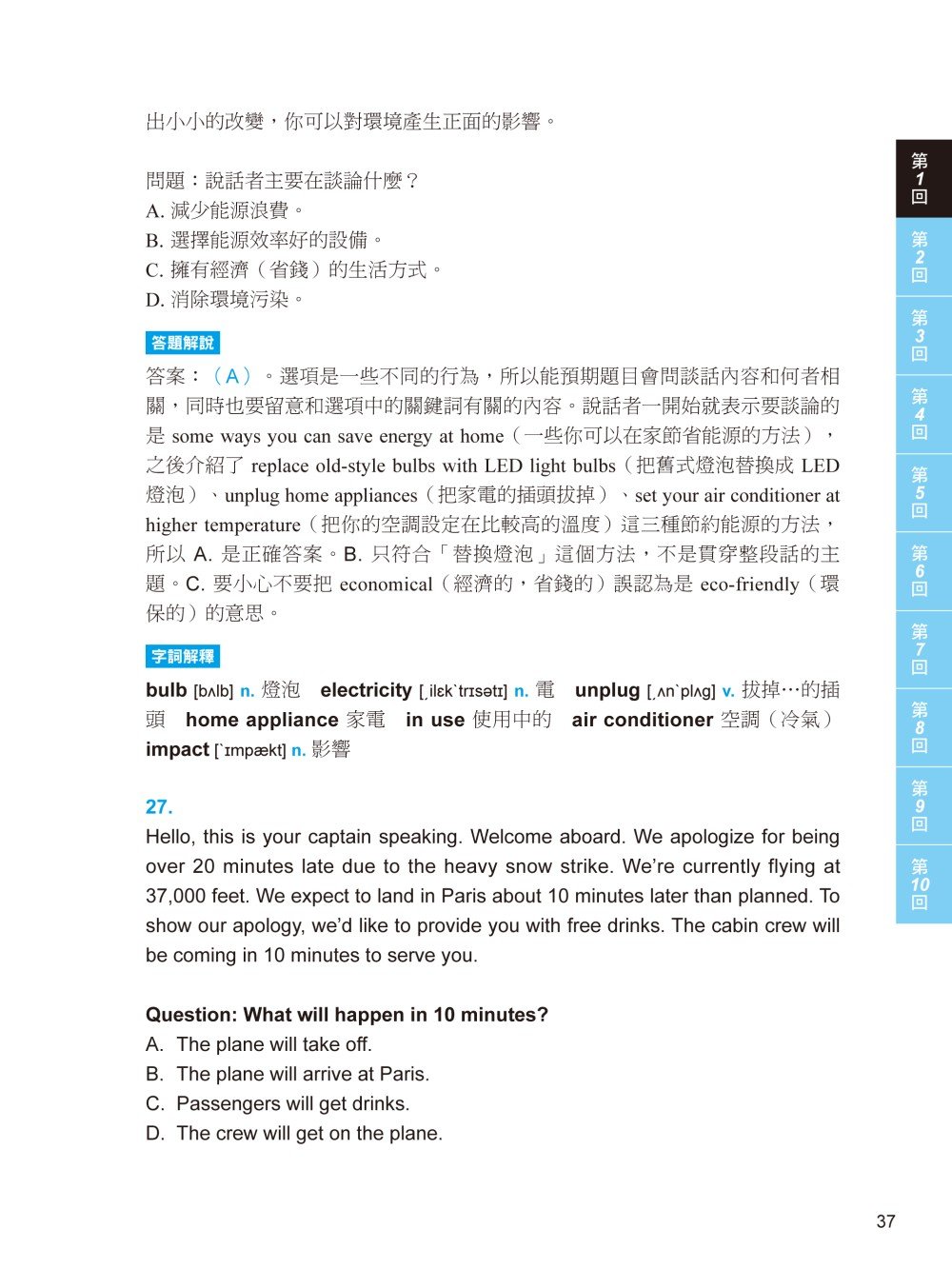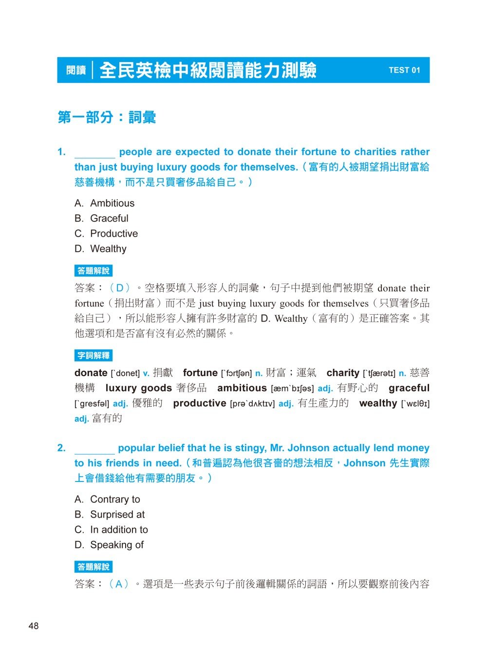 以中級英檢來說,聽力測驗的第三、第四部分出現了需要參考圖片作答的新題型,而閱讀測驗除了克漏字部分出現較長的填空內容以外,長文閱讀也增加「多文本題型」,亦即會有需要同時看兩篇文章才能回答的問題。顯然,這讓考生在「閱讀份量」上加重許多,如果不充分練習,很容易因一時緊張而在考場上腦袋一片空白!本書準備 10 回的測驗及豐富的解析,絕對讓你達到充分練習的效果及提升真正的實力。