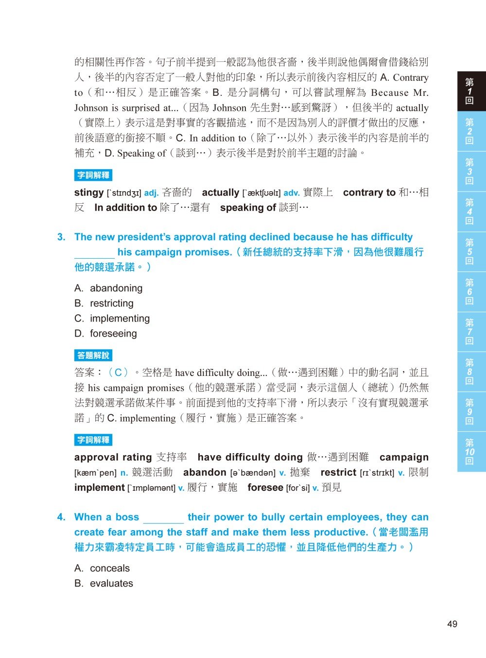 面對新制英檢更高水準的「聽力圖片題」、「長文填空」、「雙篇文章閱讀題組」,需要更多練習才能掌握答題技巧。本書提供最充足的10回聽力+閱讀模擬試題,讓讀者在反覆練習的過程中培養作答的手感。此外,解答本除了提供答案以外,也附上極為詳細的解題說明,提點與正確答案相關的各種線索,以及排除陷阱選項、避免上當的技巧。書中的解析遵照「解題SOP」,示範「看選項預測聽力錄音內容」、「從題目類型直接找出文章中相關的部分」等增加解題效率的獨家訣竅。跟著詳細的解說,一步一步破解題目,就像看老師現場教學,獨自學習也能完全掌握各類題目的精髓!