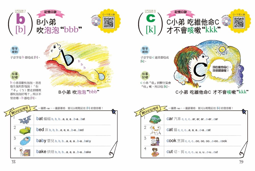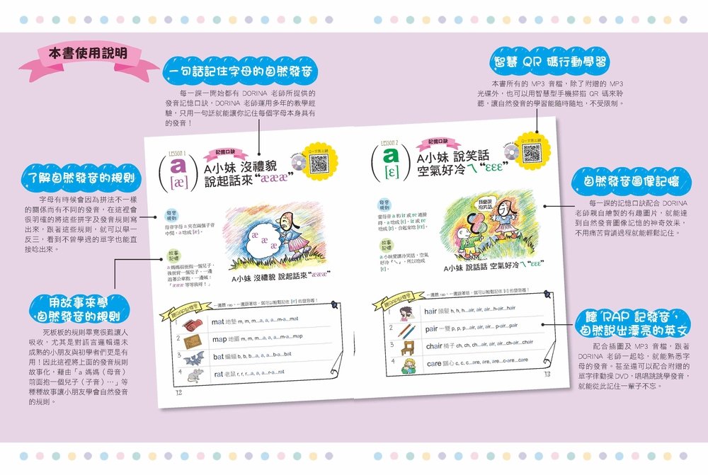 每一個發音都有單字實例並配合卡通圖畫,還可利用MP3、DVD等感官教材引導讀者親身嘗試,在「用眼看、用耳聽、開口說」的過程中,自然而然引發學習興趣,達成潛能開發的目的,培養自主學習語言的能力。