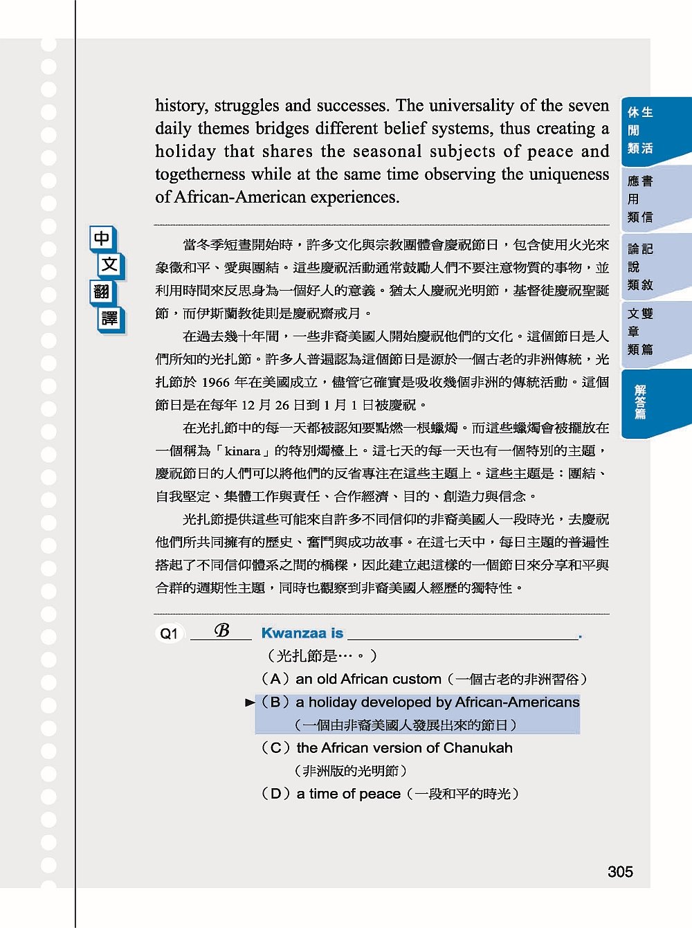 第二部分「段落填空」依照「生活休閒」、「書信應用」、「論說敘述」三種情境設計出有句子選項的題組,讓考生能依照不同情境主題學習判斷文章脈絡的能力,也增進找出正確的詞彙、文法的能力,若找到自己不熟悉的文法、句型,也能夠翻回前面的「實力培養」部分複習文法常識。