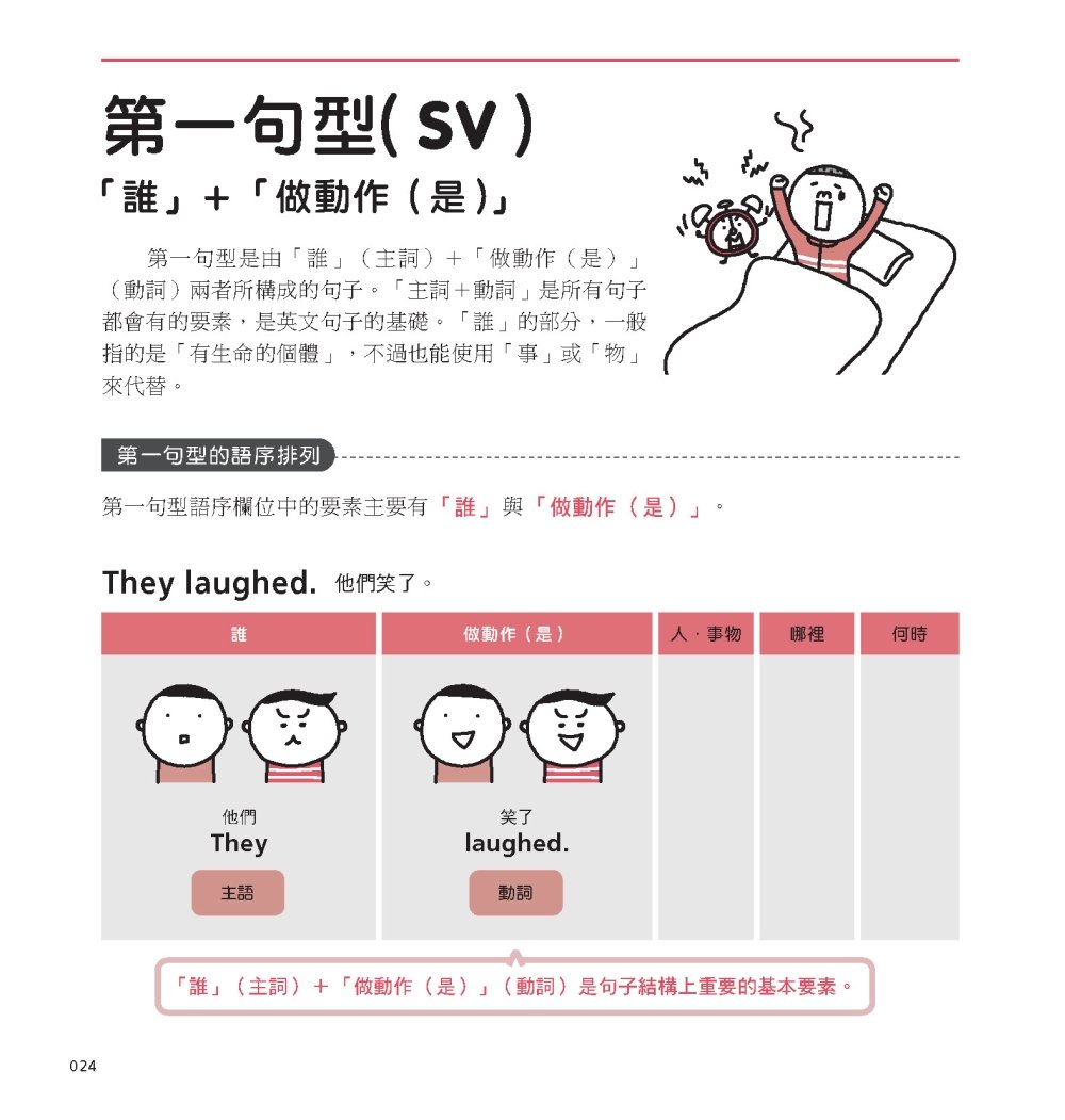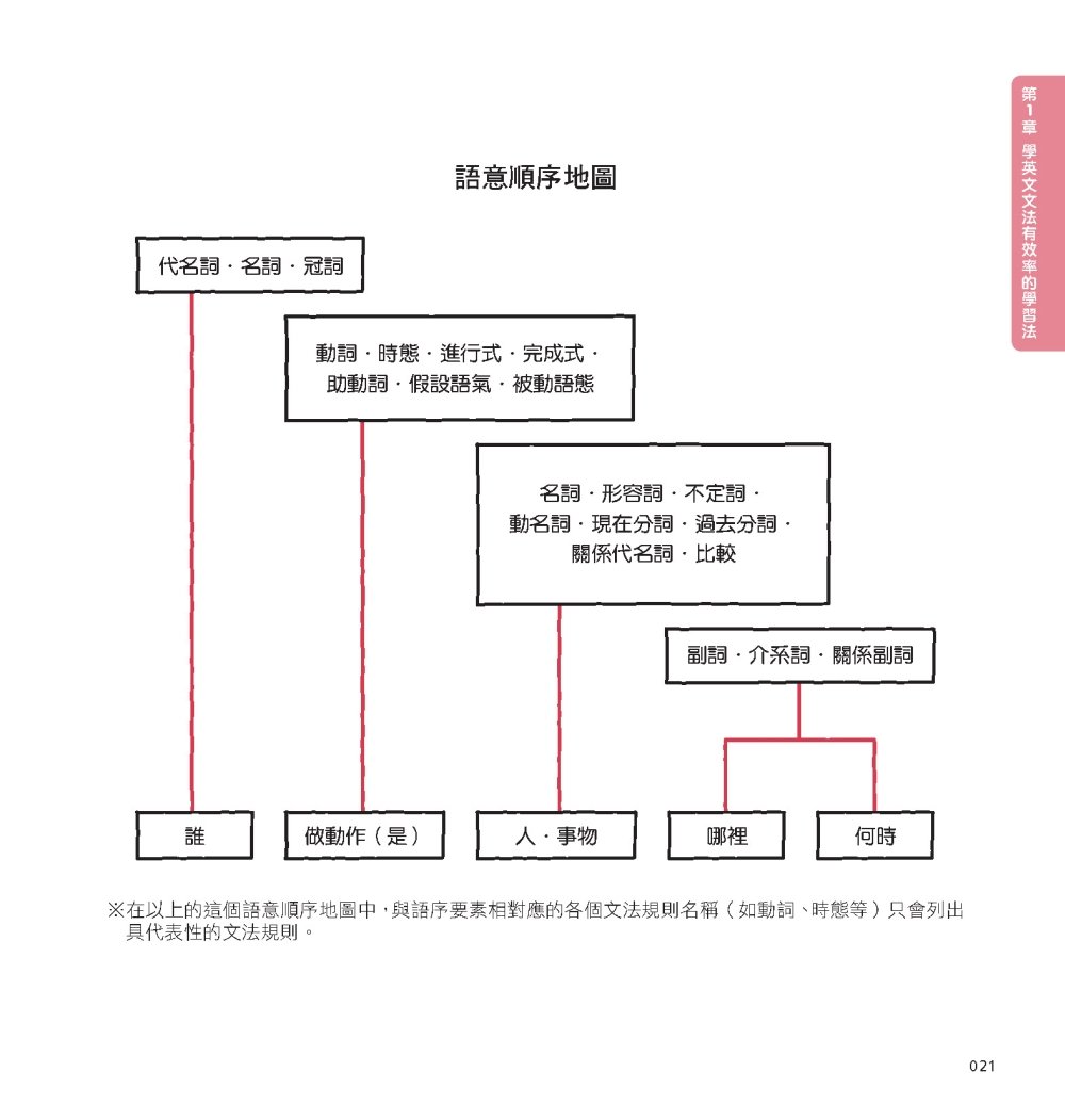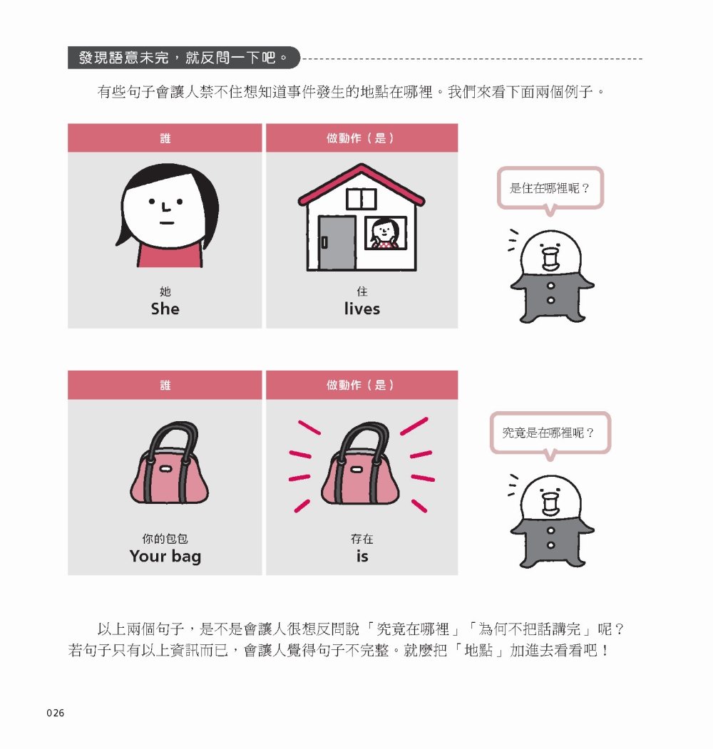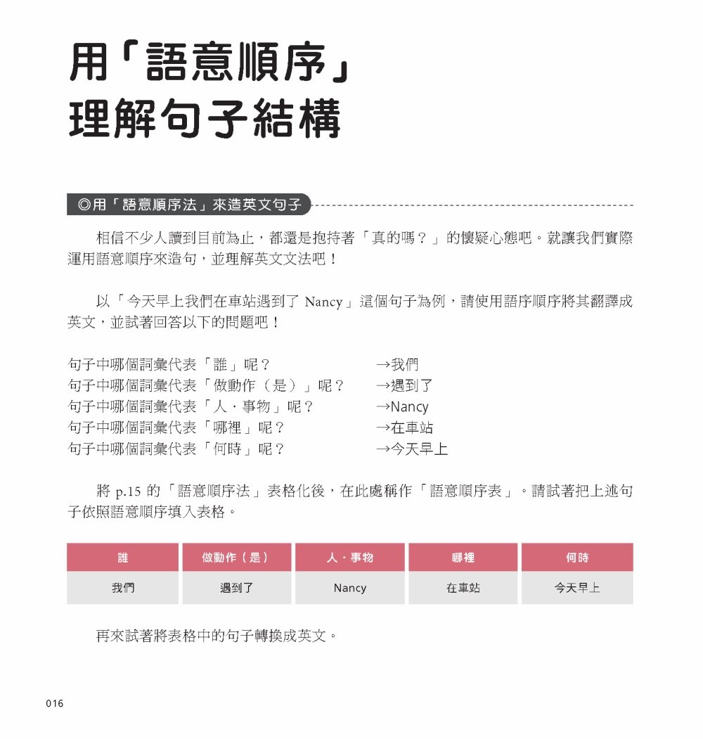 此外,在解說句子結構時,也不用一般文法書的主詞、動詞、副詞等等,而是用像是「誰、做了什麼、針對哪個人/事物」這樣連小學生都懂的文字來做說明。