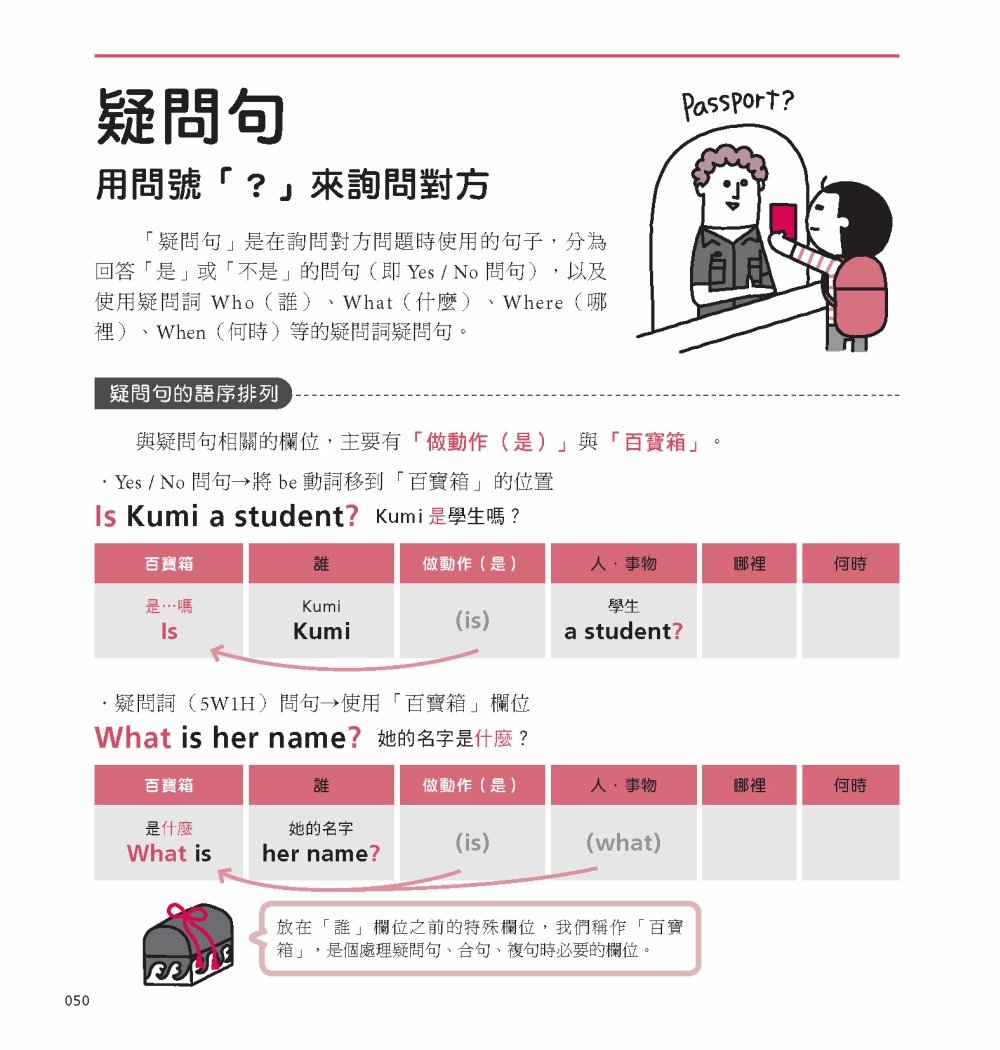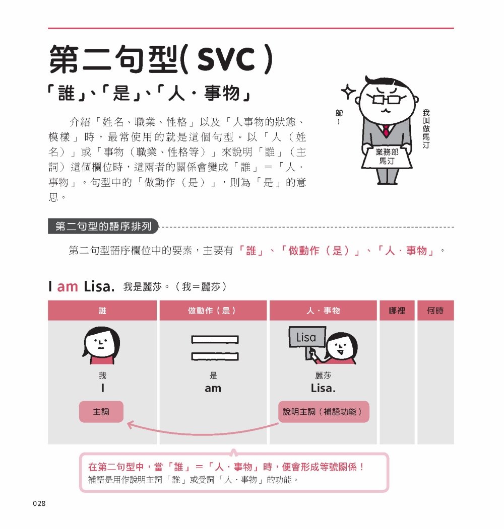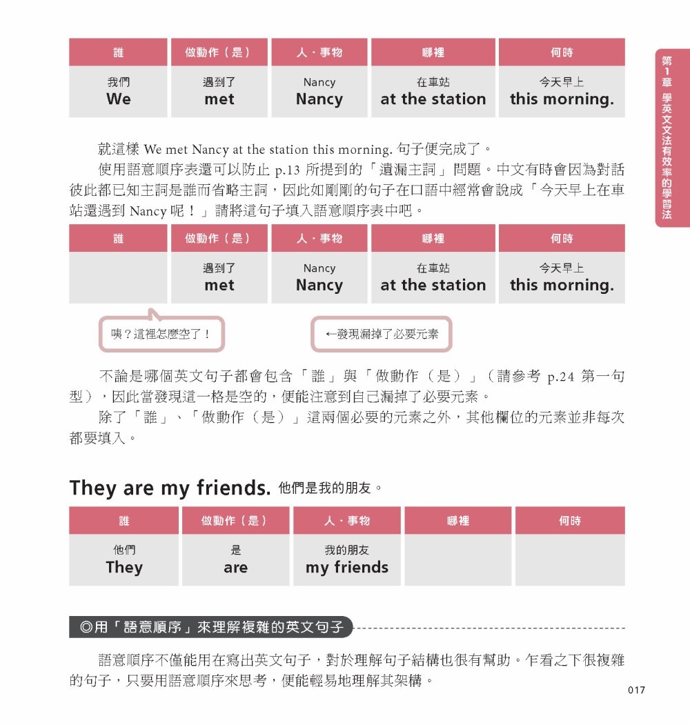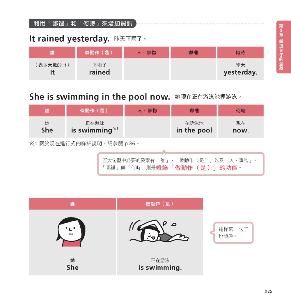 此外,在解說句子結構時,也不用一般文法書的主詞、動詞、副詞等等,而是用像是「誰、做了什麼、針對哪個人/事物」這樣連小學生都懂的文字來做說明。