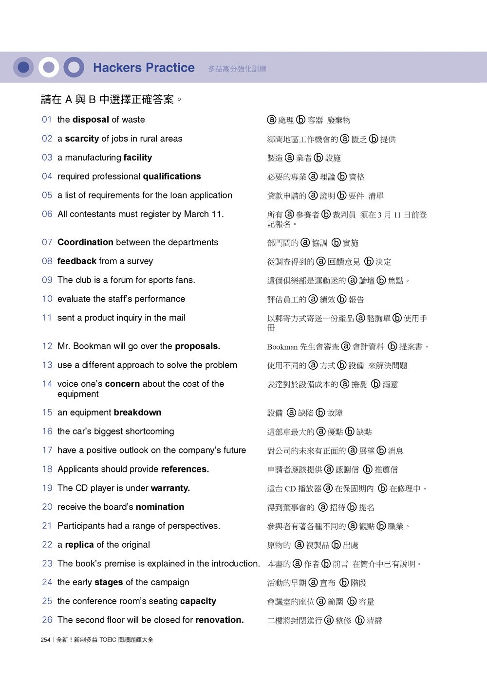 市面上的多益閱讀(TOEIC RC)教材,多如過江之鯽,但只有 David Cho 博士帶領的Hackers Academia 教學團隊,共同彙編的《新制多益閱讀題庫大全》能連續多年蟬聯暢銷寶座,成為多益考生無人不知、各家高手指名推薦的必讀經典,甚至與《新制多益聽力題庫大全》在市場上一起獲得「紅藍本」的暱稱。而自從上市以來,我們不斷接到讀者來信致謝:「雖然我的高中英文沒學好,但是讀了你們出版的『題庫大全』之後,多益的考試再也難不倒我了!」「沒想到考試竟然出現幾乎一樣的題目!」因為我們堅持每月入場調查實測試題,以最有系統的方式,分類剖析多益最常考的題目題型,搭配模仿實測內容的模擬試題,才能讓考生迅速掌握所有必考重點,並且熟悉考試內容,自然感受到成績明顯進步的效果。