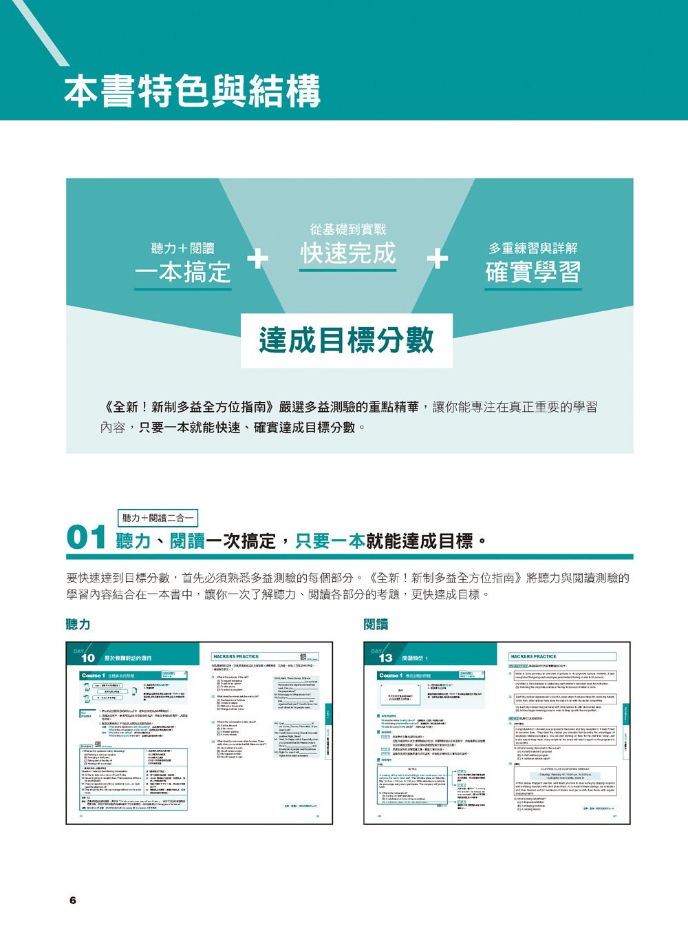 由於將聽力及閱讀測驗的學習份量濃縮為一本,所以只需要20天的時間,就能完成所有必要的學習。聽力篇、閱讀篇都分為剛剛好的20天份量,讀者可選擇聽力、閱讀同步進行,或者先從容易提高分數的聽力部分開始學習。