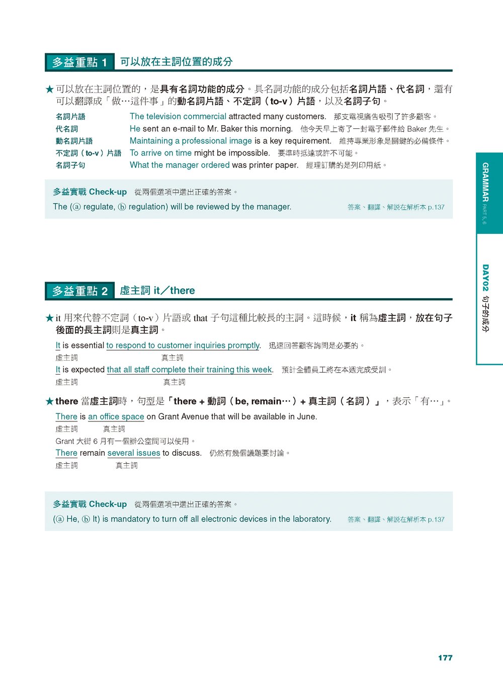 ○ 閱讀篇:分為「文法」、「閱讀」、「單字」三大部分,除了題型與解題技巧以外,同時也奠定高分必備的基礎英語力。