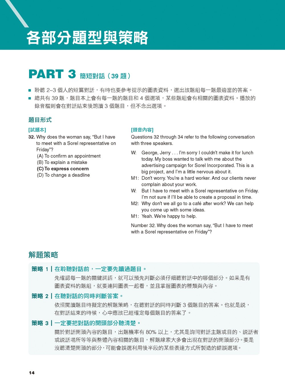 ○ 聽力篇:分類講解Part 1到Part 4的各種題型與解題策略,並搭配聽寫練習法,確實訓練「聽對、聽懂、聽出解答關鍵」的技巧。
