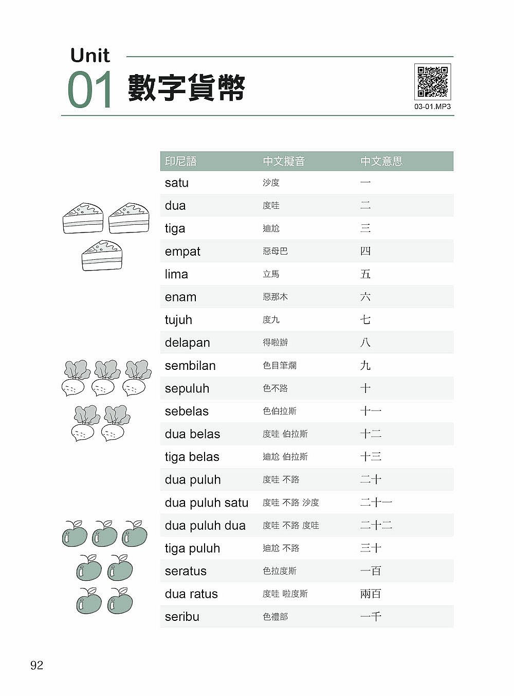 不論是字母教學、發音教學、單字、短句、會話,本書都備有QR碼線上音檔,由印尼籍人士親自錄製,能邊聽邊學,達到良好學習效果。亦提供可一次下載全書 MP3的 QR 碼,不需註冊會員,或額外安裝自己不熟悉的播放 APP,省去每次聽音檔都要掃描的麻煩!(註:打包下載檔案為ZIP壓縮檔,請先安裝解壓縮程式或APP再行下載,由於iOS系統對檔案下載的限制,iPhone用戶需升級至iOS 13以上,方可使用全書完整打包下載連結。)